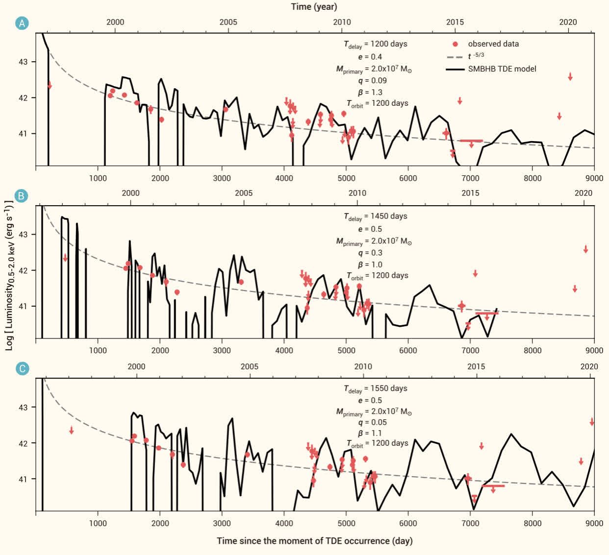通常來說,潮汐撕裂恒星事件的光度在達到峰值後會呈現單調冪律下降的趨勢。XID 935的光變之所以有趣,是因為它的光度在整體下降(近20年間變暗超過40倍直至無法探測到)的過程中,還出現了突然變暗又變亮(兩個月內變亮超過27倍)的情況,預示着這可能是一例發生在超大質量雙黑洞系統中的潮汐撕裂恒星事件——這樣的事件非常罕見,之前僅有兩例候選體,但它們的數據質量都遠不如XID 935,且距離我們都要近得多。與普通的單黑洞潮汐撕裂恒星事件不同,當一顆恒星被主黑洞撕裂,恒星殘骸流可能會被次黑洞干擾,導致無法正常回落到主黑洞,物質供給的中斷導致光度驟然下降;當次黑洞遠離後,恒星殘骸流又能正常回落到主黑洞,於是主黑洞繼續吸積殘骸從而恢復光度。